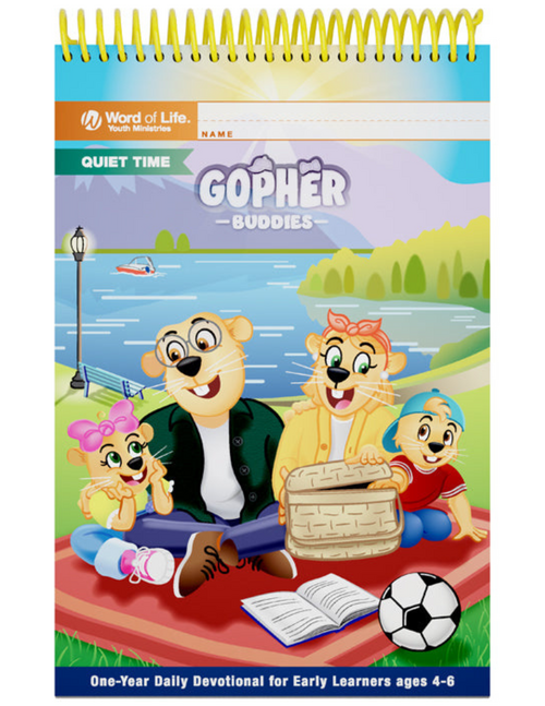 The Gopher Buddies Quiet Time Diary (ages 4-6) is a full-color daily devotional with age-appropriate activities for early learners.